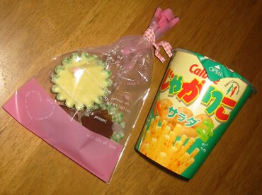P.S. ジャガ○コも、Aちゃんから。食べられないチョコの代わりに食べられるお菓子を持参してくれました。遠足の時に、殿が食べていたのを見てたのかな・・・やさしい心の娘さんに育てられた親御さんに、思いを馳せてしまいます。親御さんへも感謝です。ありがとうございます。