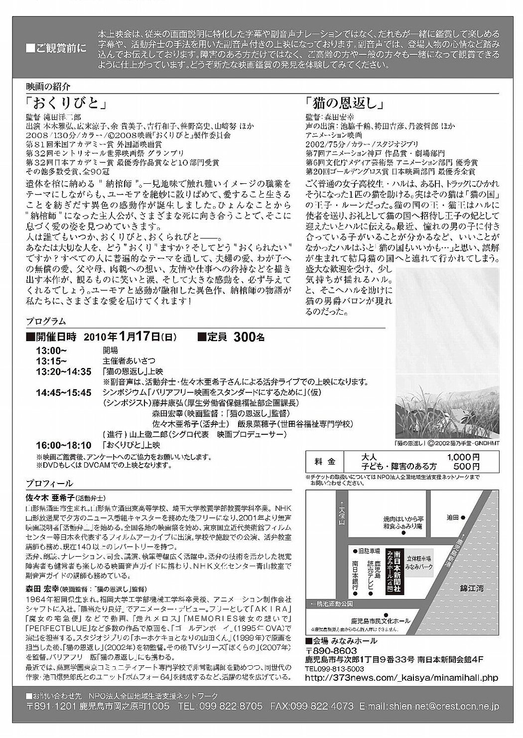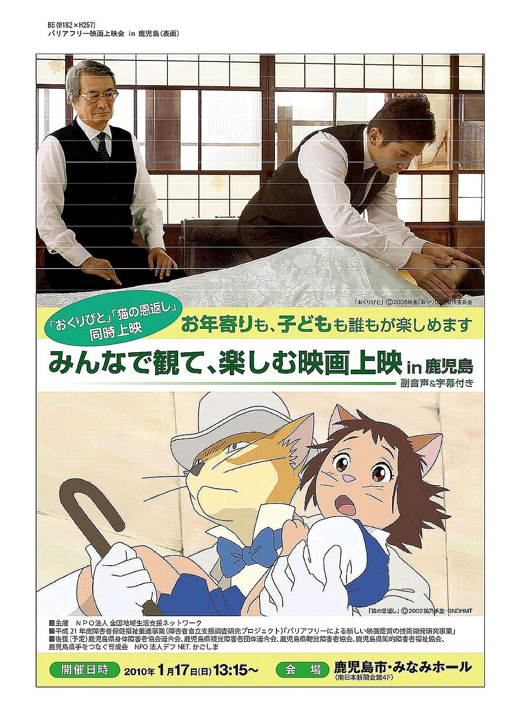 鹿児島市のみなみホール(南日本新聞会館)でバリアフリー映画の上映会が企画されております。バリアフリー映画とは、見えない人も聞こえない人も、一緒に映画を楽しもう、というコンセプトで、映画に字幕と副音声をつけたものだそうです。上映は、2010年1月17日(日)。13時開場です。上映作品は、『猫の恩返し』と『おくりびと』料金は、大人 1000円 子ども・障害のある方 500円途中シンポジウムもあります。詳しいお問い合わせは、特定非営利活動法人 全国地域生活支援ネットワーク事務局 鹿児島市岡之原町1005 tel:099-822-8705 fax:099-822-4073 へ、お願いいたします。チラシも是非、御覧くださいませ。
