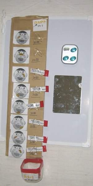 歯磨き説明の紙①~⑧を各部位の歯みがきが終わる毎にボードの最下部に取り付けた”おわりBOX”に移していくことで、より「歯磨き」の流れと見通しが明確になりました。