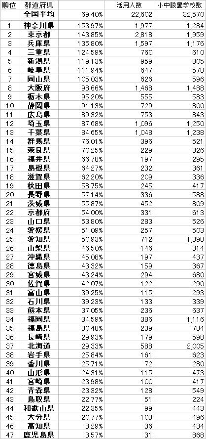 単純に活用(配置)比を都道府県別にはじき出すと次の通り