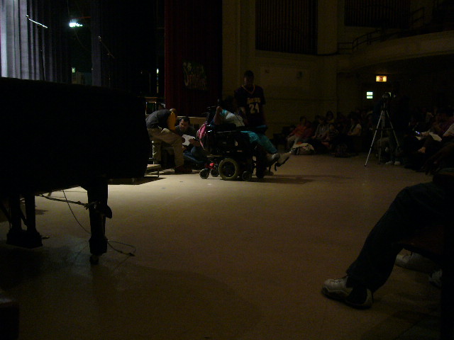 ベンはステージにあがると、にこにこしながらギターを弾きはじめた。3つのコードと音だけで演奏できる「ルイ・ルイ」だ。2人だけの演奏だが、もう一人の子がコードを弾けるので、ベンは単音3つを弾くだけで何とかなっている。幼稚園児から高校生までの自閉症児が一同に集まっての学芸会は、今年もそれぞれが出来る事を一生懸命にやっていた。どうしたって比べることの出来ないこのパフォーマンスを見ていると、表現することの純粋な喜びが目の前に広がってくる。車いすに乗った高校生の女の子は、アリシア・キースの「No One」を歌った。無心に歌う表情は幸せに満ちあふれていて、聴いている側の気持も彼女の喜びに合流してゆくのだった。パフォーマンスを見ていると、本当にそれぞれに違った自閉症の症状があり、単に障害を持っているというだけの観点に加えて、それぞれの障害を考えさせられる場面でもある。ある生徒は自閉症に関してのスピーチを何のよどみも無く読み上げ、先生やスタッフに感謝の辞を述べるが、客席ではステージに上がることもままならず、スタッフと一緒に座っていなければならない生徒もいるのだ。だからクラスがあっても、それぞれの能力に合わせて結局は一人一人に対応してゆく必要があるわけで、先生方の努力も大変なものに違いない。今後、自閉症教育の専門家がたくさん必要になってくるのは間違いないし、スタッフを減らさない為の予算を確保しておくことは、彼らの将来にとって絶対不可欠だろう。幼稚園クラスの演技を見ていて、ベンが小さかった頃の事を懐かしく思い出す。皆がそれぞれに、それぞれの方法で成長してゆくのだった。
