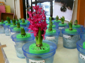 最近、偏食が少しだけ和らいできました。たんぱくしつや野菜をほとんど摂らなかったのに、具入りのチャーハン、焼きそばを食べるように。ピーマンと卵なんて、食べるわけないよね・・・と入れてみたりしたら、食べる食べる・・・!またまた夢のようです。魚も食べるようになりました。アジの干物と塩鮭だけですが。結局塩味が好きなのね。さて、不思議なことがありました。幼稚園のヒヤシンスがツヨのだけ咲きました!本当にツヨのだけ、たくさんのつぼみのなか、みるみる満開に!